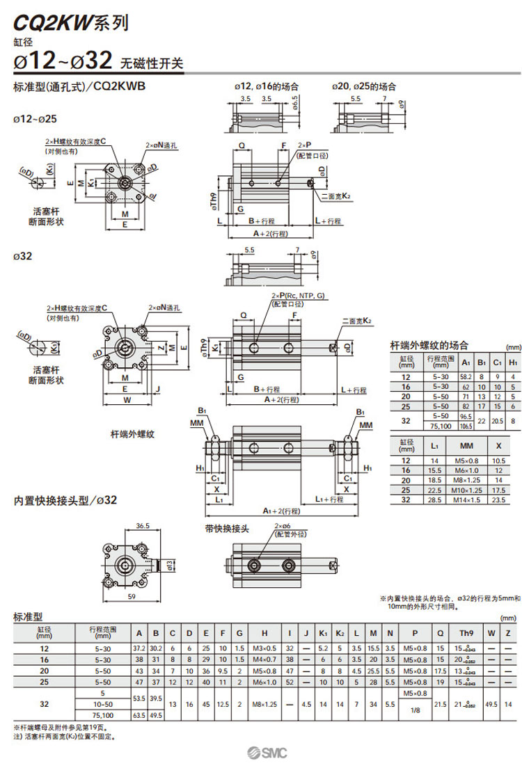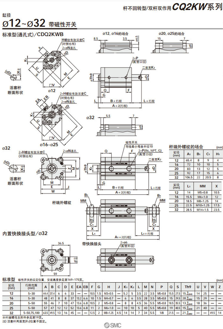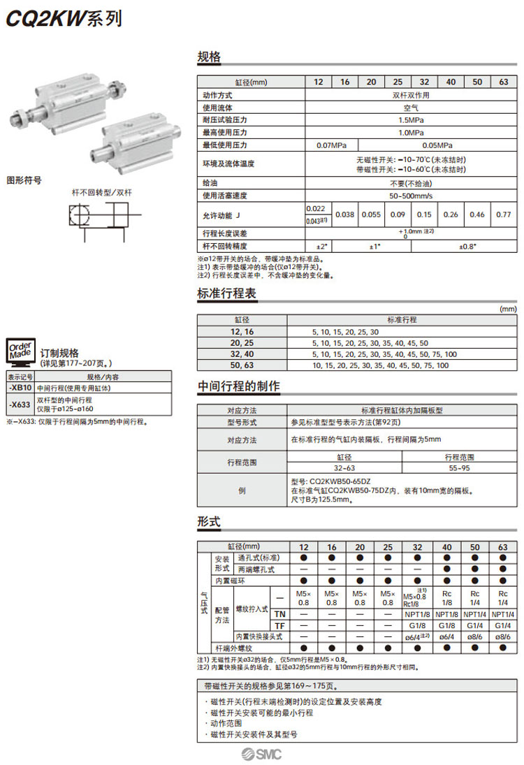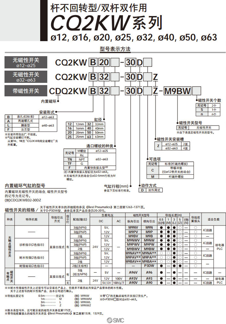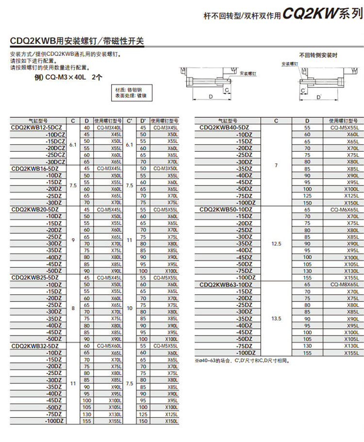 CDQ2KWD63-45D,CDQ2KWD63-50D,CDQ2KWD63-75D,CDQ2KWD63-100D,CDQ2KWD63-40D,SMC桿不回轉型氣缸