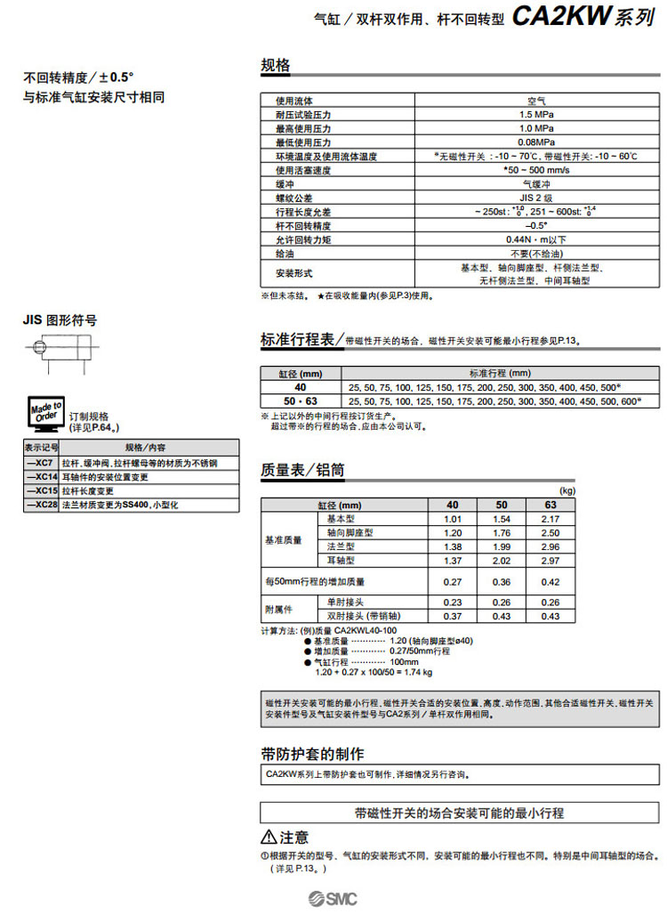 CDA2KWT40-500,CDA2KWT50-500,CDA2KWT63-500,CDA2KWB50-600,CDA2KWB63-600,CDA2KWL50-600,CDA2KWL63-600,SMC桿不回轉型氣缸