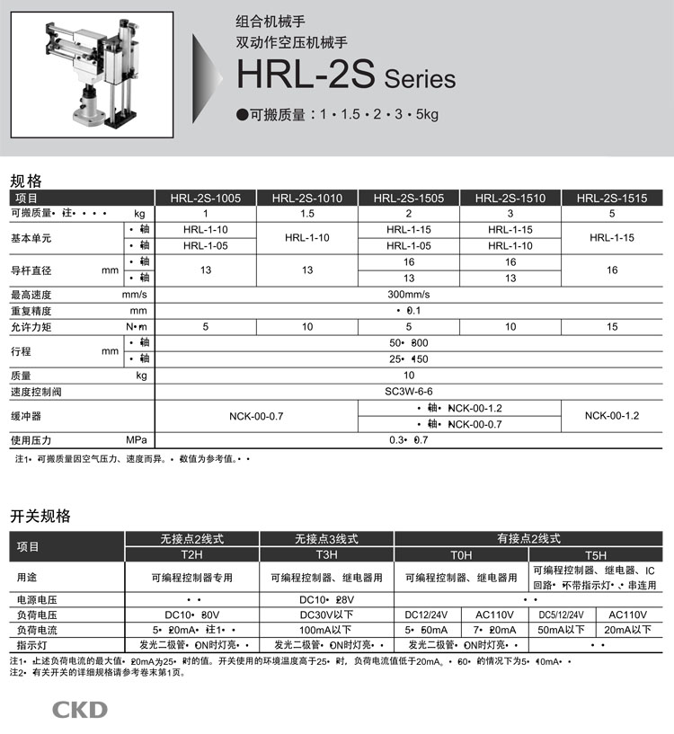 HRL-2S-1005,HRL-2S-1010,HRL-2S-1505,HRL-2S-1510,HRL-2S-1515,CKD雙動(dòng)作空壓機械手