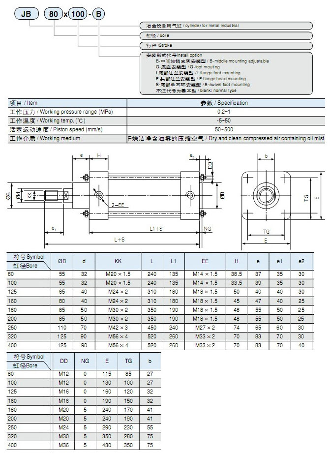 JB80×100,JB100×100,JB125×100,JB160×100,JB180×100,JB200×100,JB250×100,JB320×100,JB400×100,冶金氣缸