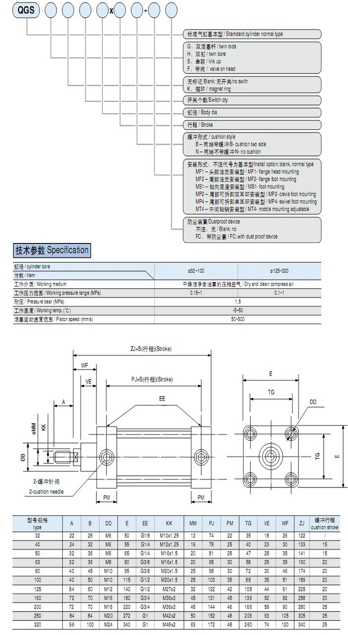 QGSG32,QGSG40,QGSG50,QGSG63,QGSG80,QGSG100,QGSG125,QGSG160,QGSG200,QGSG250,QGSG320,標準氣缸