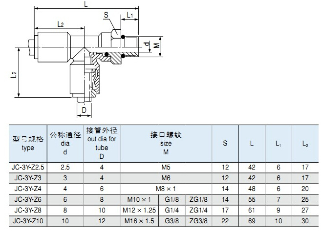 ②:插入式三通終端變徑管接頭 公稱(chēng)通徑 6MM B=8MM C=4MM JC-3T-Z6-8-4 M10×1