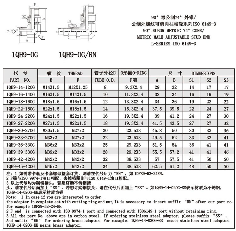 1QH9-14-120G,1QH9-16-140G,1QH9-18-160G,1QH9-22-180G,1QH9-39-330G,1QH9-42-420G,錐面密封接頭