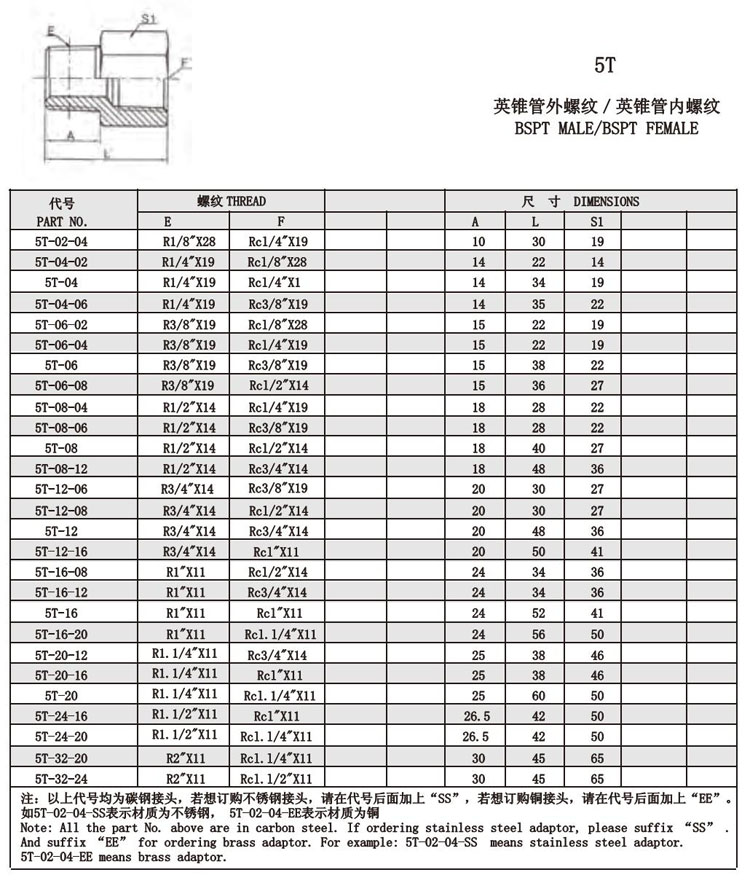 5T-02,5T-04,5T-06,5T-08,5T-12,5T-16,5T-20,5T-24,5T-32,內螺紋接頭
