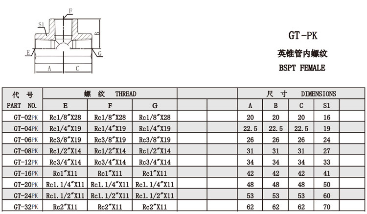 GT-02PK,GT-04PK,GT-06PK,GT-08PK,GT-12PK,GT-16PK,GT-20PK,GT-24PK,GT-32PK,英錐管內螺紋接頭