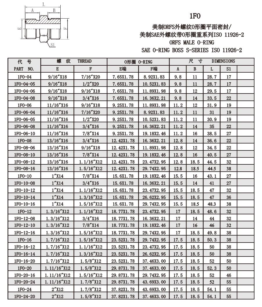 1F0-04,1F0-06,1F0-08,1F0-10,1F0-12,1F0-16,1F0-20,1F0-24,美螺紋O形圈密封接頭