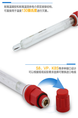 LR-PH5051電極采用耐高溫凝膠和耐高溫固體電介質(zhì)雙液接界結構,電極在不接反壓的情況下,耐壓0.6MPa,可直接用于溫度130℃進(jìn)行滅菌,無(wú)需補充電介質(zhì),維護量小采用S8插口、K8S、VP、PG13.5螺紋插口,可用于國外電極的互換使用,電極長(cháng)度可根據需要選用,與361L不銹鋼護套配合使用。