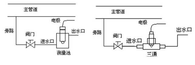 為保證電極在管路上正確測量出pH值,應避免測量池間出現氣泡而造成數據失準,請嚴格按下圖安裝:, ,