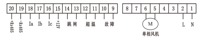 注:產(chǎn)品帶有485通訊輸出(端子19,20)標準的MODBUS,同時(shí)帶有3路4~20mA模擬量輸出(Ia、Ib、Ic,端子18,17,16)這2項功能為可選功能,單相風(fēng)機的接線(xiàn)圖如上圖所示。