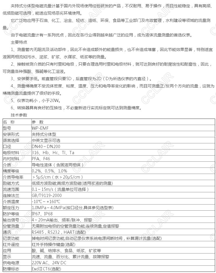 WP-EMF-DN40,WP-EMF-DN50,WP-EMF-DN65,WP-EMF-DN80,WP-EMF-DN100,WP-EMF-DN125,WP-EMF-DN150,WP-EMF-DN200,夾持式分體型電磁流量計