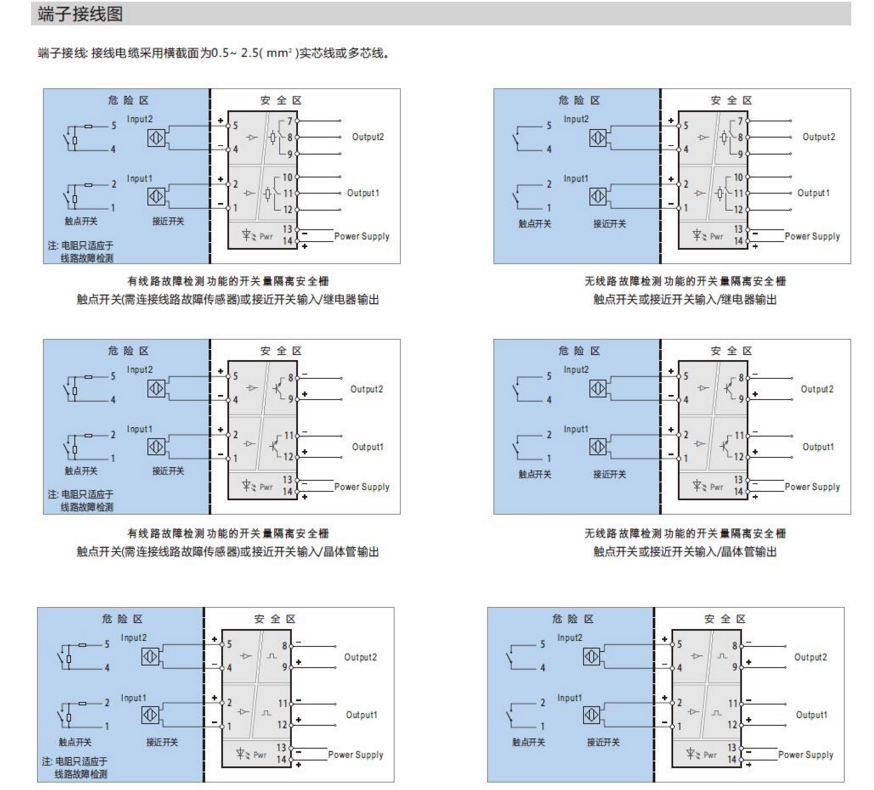 (說(shuō)明: 當用到線(xiàn)路檢測功能時(shí),如果需要使用機械觸點(diǎn)開(kāi)關(guān)作為輸入設備,必須在輸入回路中連接線(xiàn)路故障傳感器,以避免開(kāi)關(guān)量隔離安全柵將機械觸點(diǎn)開(kāi)關(guān)正常的通斷誤當做輸入回路的斷路或短路故障。)