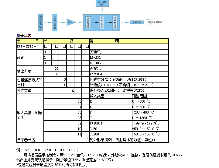SWP-CT80溫度現場(chǎng)變送控制器是本公司推出新一代先進(jìn)的現場(chǎng)變送單元。該變送器采用先進(jìn)的低功耗CPU配合大屏幕LCD顯示,采用鋰電池供電,可提供長(cháng)達二年以上的連續工作時(shí)間,免維護。采用鋁合金外殼進(jìn)口的高精度的鉑電阻傳感器或熱電偶傳感器,抗腐蝕,抗過(guò)載,穩定性好,精度高,集測量顯示變送,控制,通訊為一體??蓱糜谑?,化工、冶金等部門(mén)各種腐蝕和非腐蝕性液體和氣體測量與控制。