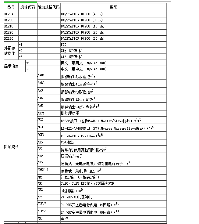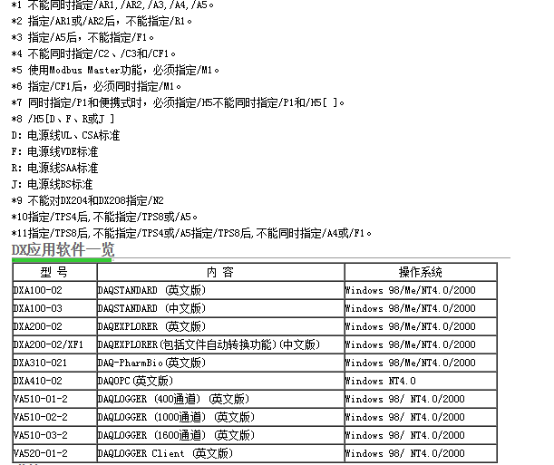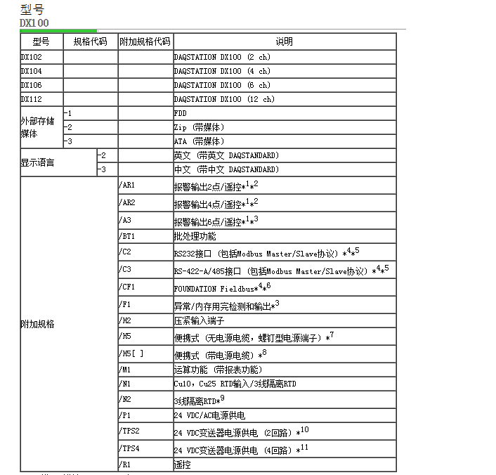 | *1 不能同時(shí)指定/AR1、/AR2和/A3。 *2 指定/AR1或/AR2后,不能指定/R1。 *3 指定/A3后,不能指定/F1。 *4 不能同時(shí)指定/C2、/C3和/CF1。 *5 使用Modbus Master功能,必須指定/M1。 *6 指定/CF1后,必須同時(shí)指定/M1。 *7 同時(shí)指定/P1和便攜式時(shí),必須指定/H5不能同時(shí)指定/P1和/H5[ ]。 *8 /H5[D、F、R或J ] D:電源線(xiàn)UL、CSA標準 F:電源線(xiàn)VDE標準 R:電源線(xiàn)SAA標準 J:電源線(xiàn)BS標準 *9 不能對DX102和DX104指定/N2 *10指定/TPS2后,不能指定/TPS4,/AR2或/A3。 *11指定/TPS4后,不能指定/TPS2,/AR2,/A3或/F1。 |