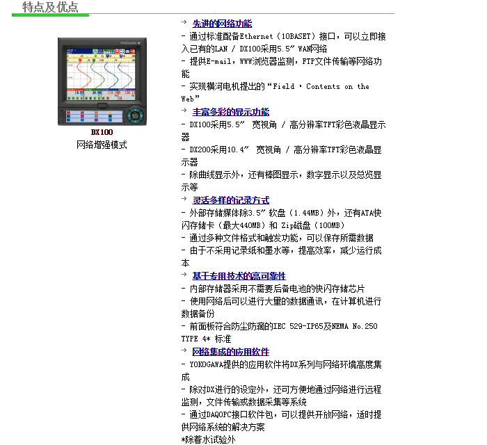 QSTATION網(wǎng)絡(luò )增強型DX系列在高分辨率TFT彩色液晶顯示器上實(shí)時(shí)顯示測量值。數據可以保存到3.5英寸軟盤(pán)、ATA快閃存儲卡、ZIP磁盤(pán)。DAQSTATION網(wǎng)絡(luò )增強型有內置網(wǎng)頁(yè)服務(wù)器和E-mail功能,標準配置以太網(wǎng)接口,支持TCP/IP和FTP協(xié)議。附加的通信功能包括帶主/從模式的Modbus功能和FF現場(chǎng)總線(xiàn)功能。