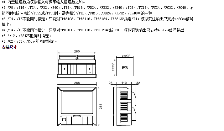 | ●報警輸出繼電器(/A12,/A24): 輸出點(diǎn)數:從12、24點(diǎn)中選擇。 ●通信功能(/C2,/C3) 媒體:RS-232(/C2)或RS-485(/C3) 協(xié)議:Modbus-RTU(從機)協(xié)議 通信速率:1200/2400/4800/9600/19200/38400/57600 ●打印功能(/C4) 打印機:面板式微型打印機。 打印內容:實(shí)時(shí)數據、歷史數據、累積報表。 打印方式:手工打印、定時(shí)打印。 ●模擬輸出(/T4,/T8) 信號類(lèi)型:4-20mA 輸出點(diǎn)數:從4,8點(diǎn)中選擇。 輸出方式:測量通道的變送輸出。 最大負載:750Ω ●24VDC變送器電源輸出(TP8): 輸出點(diǎn)數:8回路。 輸出電壓:24VDC。 額定輸出電流:4~20MADC。 最大輸出電流:65mAdc(過(guò)電流保護動(dòng)作電流:約90mA) |