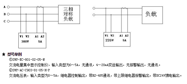 SWP-LED系列交流電量集中測量顯示控制儀用于測量采樣電壓和電流互感器信號,測量頻率,電壓和電流以及功率因數和單相有功功率P有=U·I·CosΦ或三相有功功率P有= ![]()