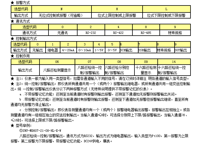 可選擇各輸入通道統一報警控制輸出(或統一變送輸出)或各輸入通道分別報警控制輸出(或分別變送輸出)。各通道統一報警控制輸出并且可選擇報警帶記憶(任一通道報警未解除將一直報警直至所有通道均無(wú)報警)或報警無(wú)記憶(巡回至有報警通道時(shí)輸出報警,巡回至無(wú)報警的通道時(shí)則不報警)。