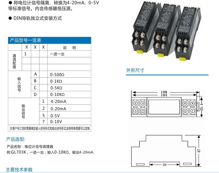 GL703K信號隔離調理器輸入范圍:0-500Ω 0-1KΩ、0-10KΩ、0-20KΩ等用戶(hù)特定規格