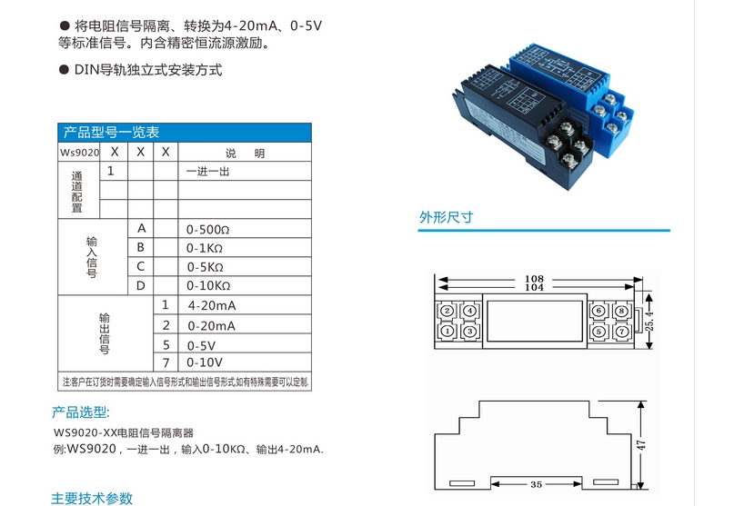 WS9020電阻信號隔離器,變送器,內含精密恒流源激勵,將電阻位置信號轉換為過(guò)程信號,輸入、輸出、電源三端口隔離, DIN T型導軌安裝