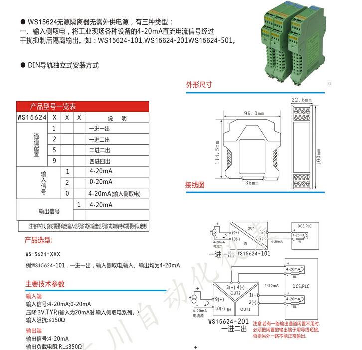 將輸入的四路信號隔離輸出,無(wú)需外接電源可正常工作,輸入輸出隔離,傳輸精度高,DIN T型導軌安裝