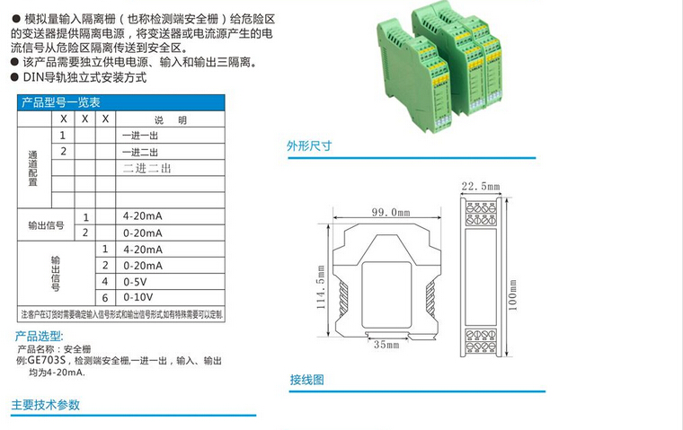 GE703S系列防爆安全柵4-20mA 隔離式安全柵 檢測端安全柵, 將輸入信號檢測端4-20mA變換為相互隔離的信號,低功耗,低熱量,低漂移,DIN T型導軌安裝