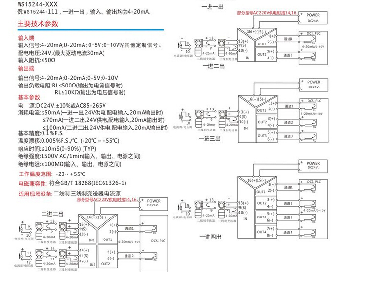 WS15244直流信號隔離器,全隔離信號分配器 隔離柵,信號隔離器模塊,安全柵,電流轉換模塊。將輸入信號變換為兩路相互隔離的信號,低功耗,低熱量,低漂移,DIN T型導軌安裝