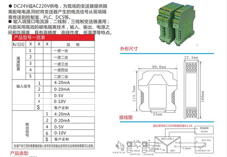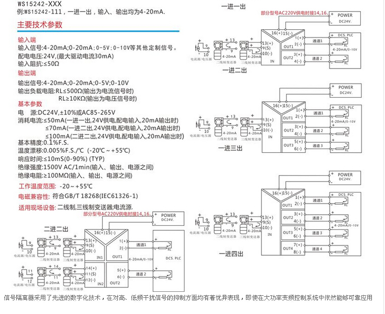 WS15242全隔離雙輸出信號分配器,將輸入信號變換為兩路相互隔離的信號,低功耗,低熱量,低漂移,DIN T型導軌安裝