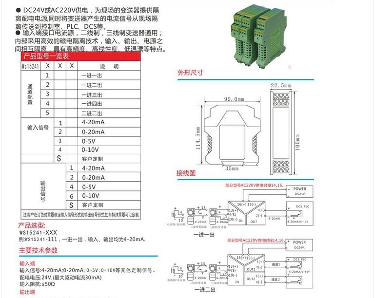 WS15241有源信號隔離器,全隔離輸出信號分配器 隔離柵,信號隔離器模塊,安全柵,電流轉換模塊。將輸入信號變換為兩路相互隔離的信號,低功耗,低熱量,低漂移,DIN T型導軌安裝