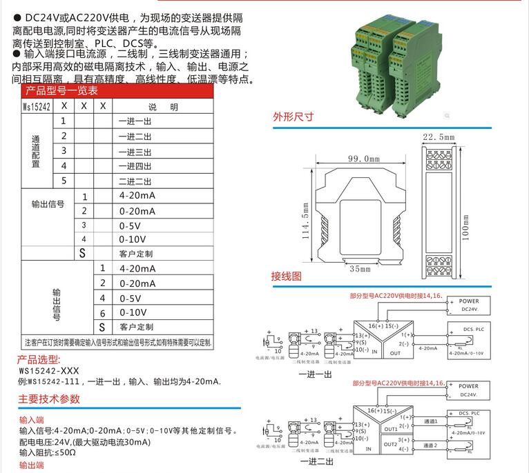 WS15242全隔離輸出信號分配器,配電器,安全隔離柵,信號隔離器模塊,安全柵,電流轉換模塊。將輸入信號變換為兩路相互隔離的信號,低功耗,低漂移,DIN T型導軌安裝,默認DC24V電源,AC220V.