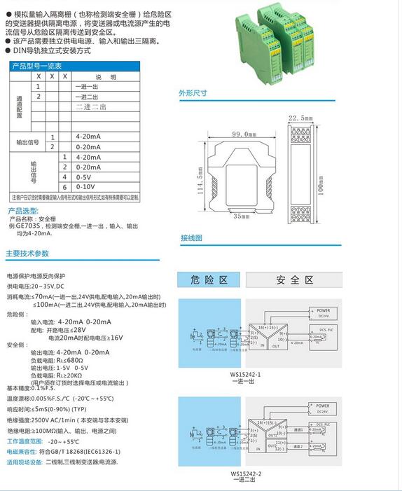 防爆安全柵4-20mA 隔離式安全柵 檢測端安全柵,將輸入信號檢測端4-20mA變換為相互隔離的信號,低功耗,低熱量,低漂移,DIN T型導軌安裝