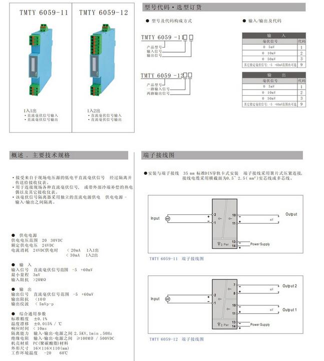 輸出類(lèi)型:0-5mv,0-10mv,0-50mv直流毫伏信號輸入隔離器. TMTY6059-11 1入1出 TMTY6059-12 1入2出