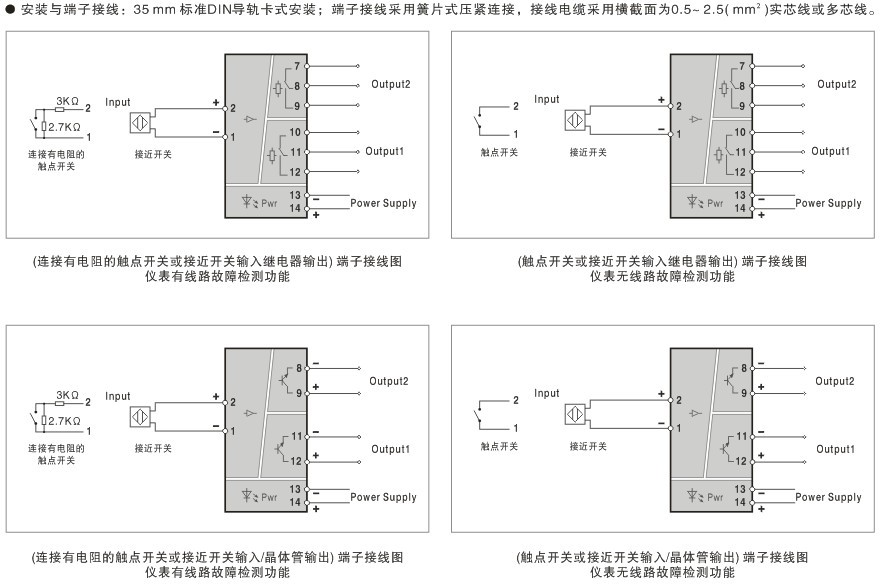 可選擇帶有輸入線(xiàn)路故障檢測功能的開(kāi)關(guān)量輸入隔離器和沒(méi)有線(xiàn)路故障檢測功能的開(kāi)關(guān)量輸入隔離器。