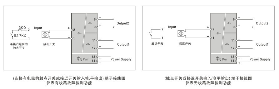 本儀表出廠(chǎng)設定為: 當檢測到輸入線(xiàn)路故障時(shí), 儀表面板上的故障檢測指示燈亮,輸出繼電器觸點(diǎn)為松開(kāi)狀態(tài) ( 如果是晶體管輸出,則晶體管不導通; 如果是電平信號輸出, 則輸出為低電平信號)。