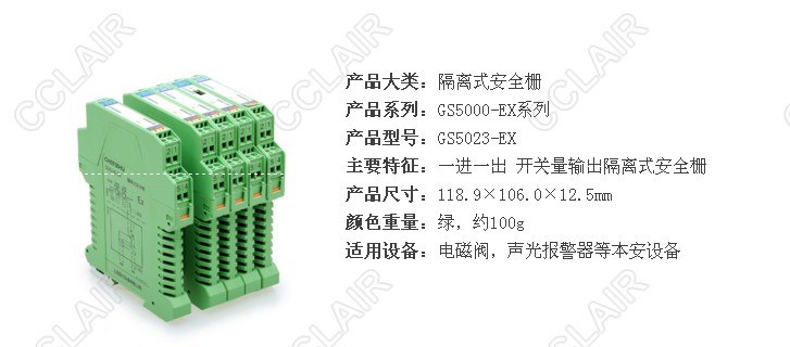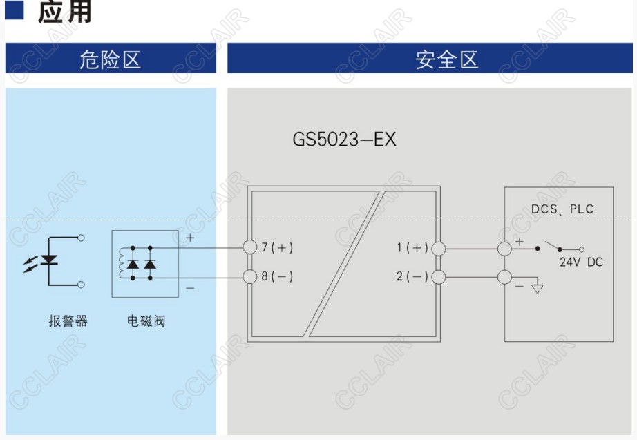 12V/45mA驅動(dòng),開(kāi)關(guān)量輸出隔離柵,將安全區的電源通過(guò)開(kāi)關(guān)控制,驅動(dòng)危險區的現場(chǎng)本安設備它,適用于驅動(dòng)如電磁閥、聲光報警器等本安設備。允許控制開(kāi)關(guān)直接連到24VDC回路的任一端。