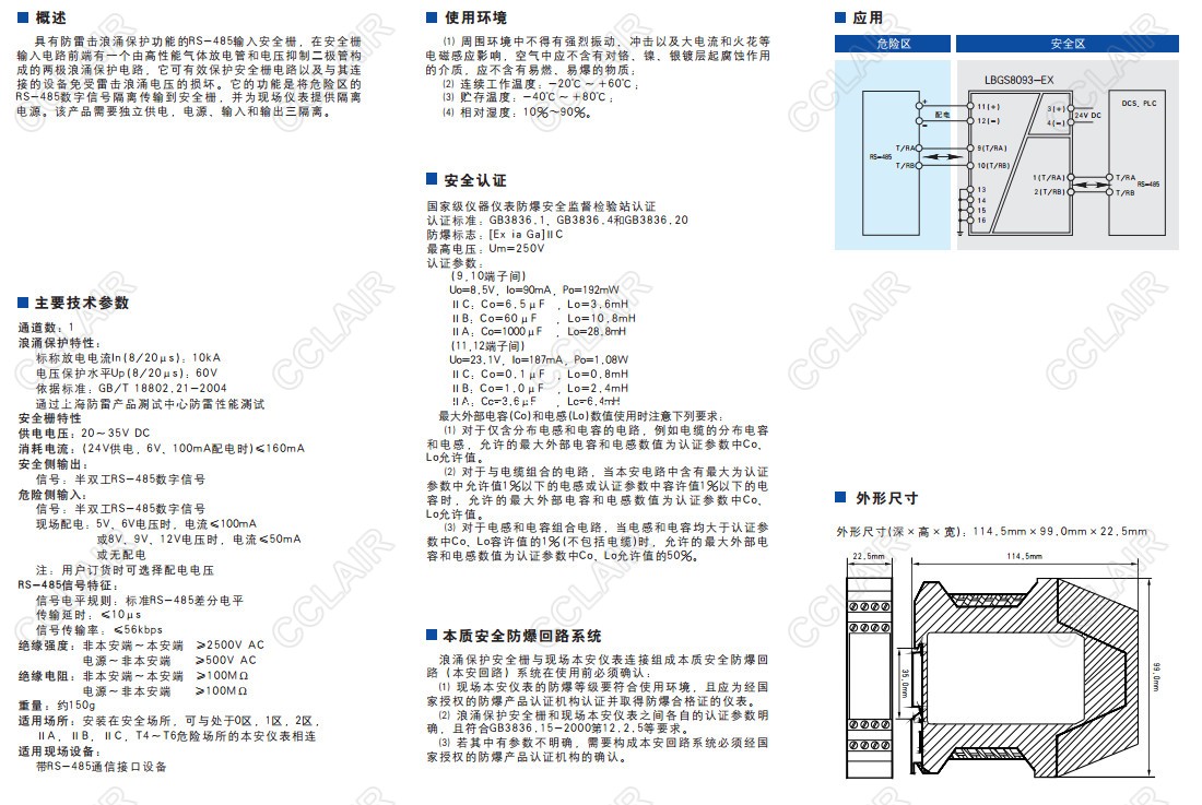 具有防雷擊浪涌保護功能的RS-485輸入安全柵。它的功能是將危險區的RS-485數字信號隔離傳輸到安全區,并為現場(chǎng)儀表提供隔離電源。該產(chǎn)品需要獨立供電,電源、輸入和輸出隔離。