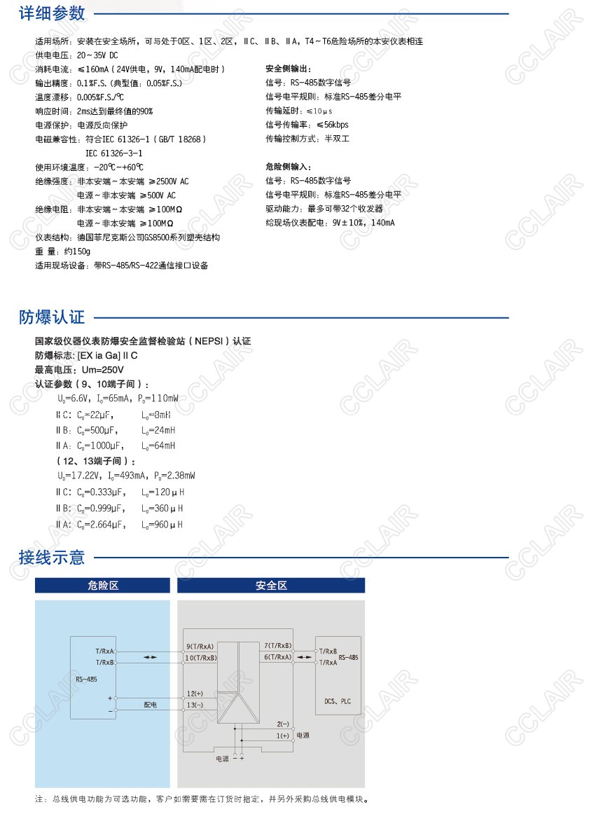實(shí)現RS-485數字信號在危險區和安全區的雙向通信,并給現場(chǎng)儀表提供隔離電源。該產(chǎn)品需要獨立供電,電源、輸入和輸出三隔離。
