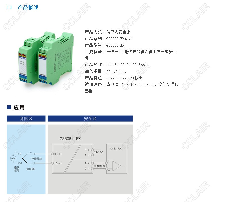 一進(jìn)一出 毫伏信號輸入輸出隔離式安全柵 將現場(chǎng)低電平直流信號1:1隔離傳輸到安全側輸出。該產(chǎn)品需要獨立供電,電源、輸入和輸出三隔離,適用于帶外部冷端補償的熱電偶。