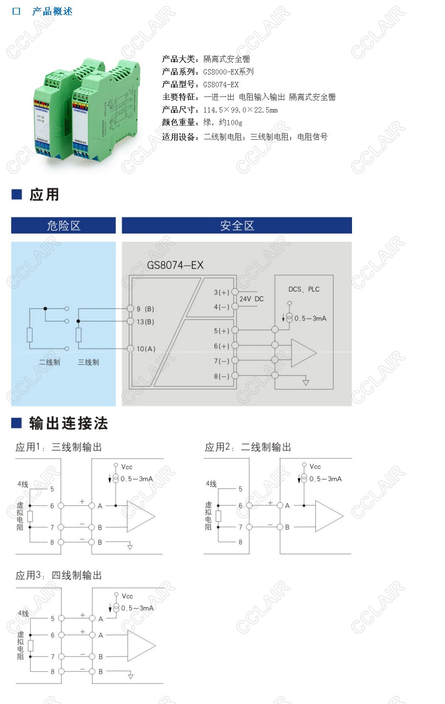 電阻輸入、電阻輸出隔離式安全柵,將現場(chǎng)二線(xiàn)制、三線(xiàn)制電阻信號1:1隔離傳輸到安全側輸出。該產(chǎn)品需要獨立供電,電源、輸入和輸出三隔離。
