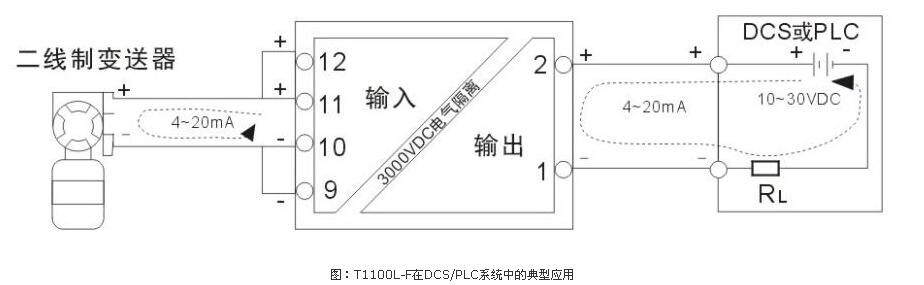 此模塊廣泛應用在DCS和PLC系統,在系統信號檢測回路中,通過(guò)金升陽(yáng)隔離變送器模塊T1100L-F模塊既能通過(guò)對輸出側取電(即輸出回路供電)供模塊正常工作,無(wú)需外接電源,有效地解決對供電電源的依賴(lài),滿(mǎn)足二線(xiàn)制回路供電的要求,又能有效地濾除信號中的干擾噪聲,實(shí)現系統狀態(tài)精準檢測,保證系統可靠穩定運行,安裝方便,可節省大量電纜和安裝維護成本,具體典型應用方案如下圖所示: