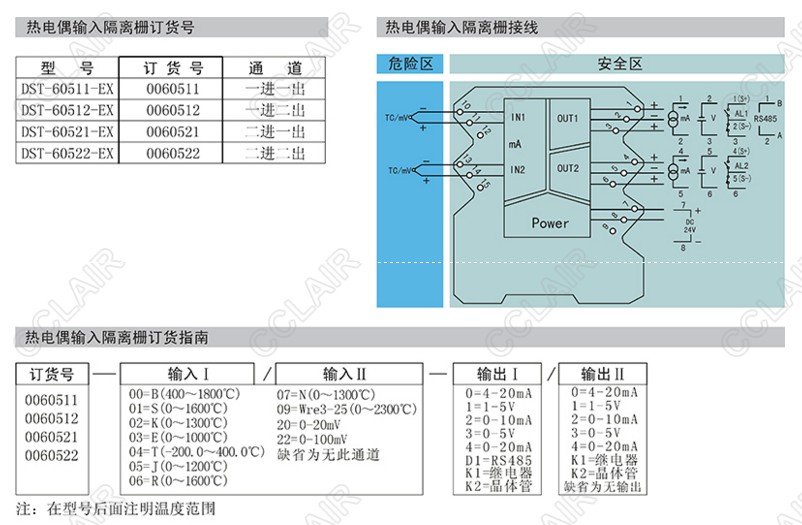 本產(chǎn)品將來(lái)自危險的熱電偶、毫伏信號轉換成電壓、電流、RS485信號或開(kāi)關(guān)量信號,從危險區隔離傳送到安全區,該產(chǎn)品需獨立供電。