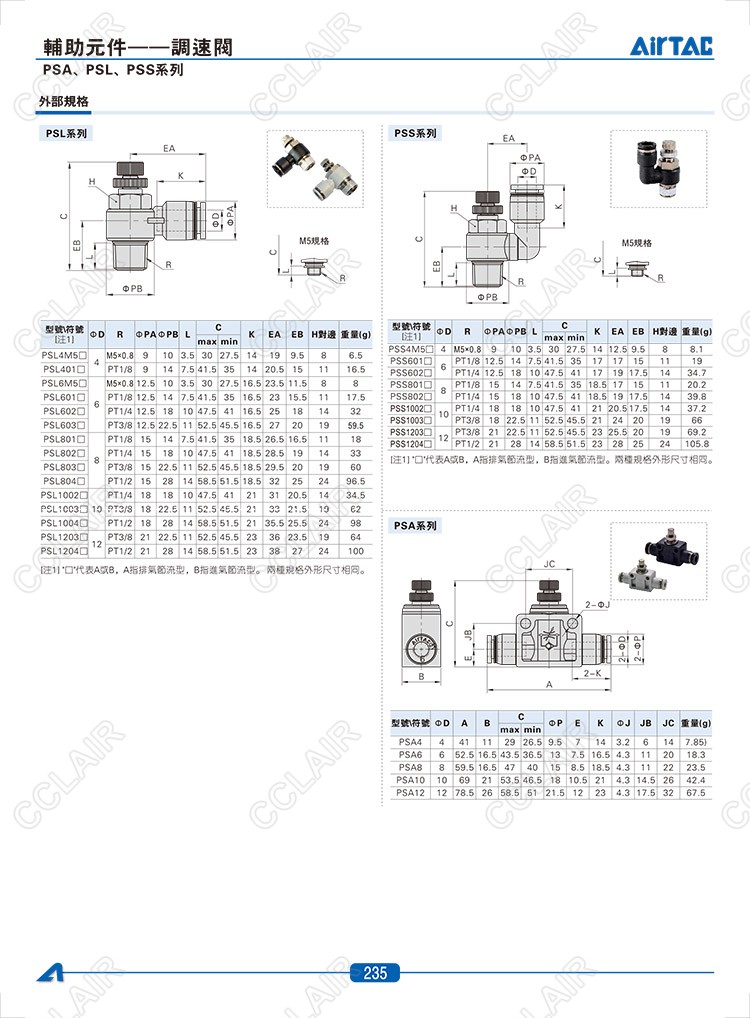 PSL4M5A,PSL4M5B,PSS4M5A,PSS4M5B,PSA4,PSA6,PSA8,AIRTAC調速閥