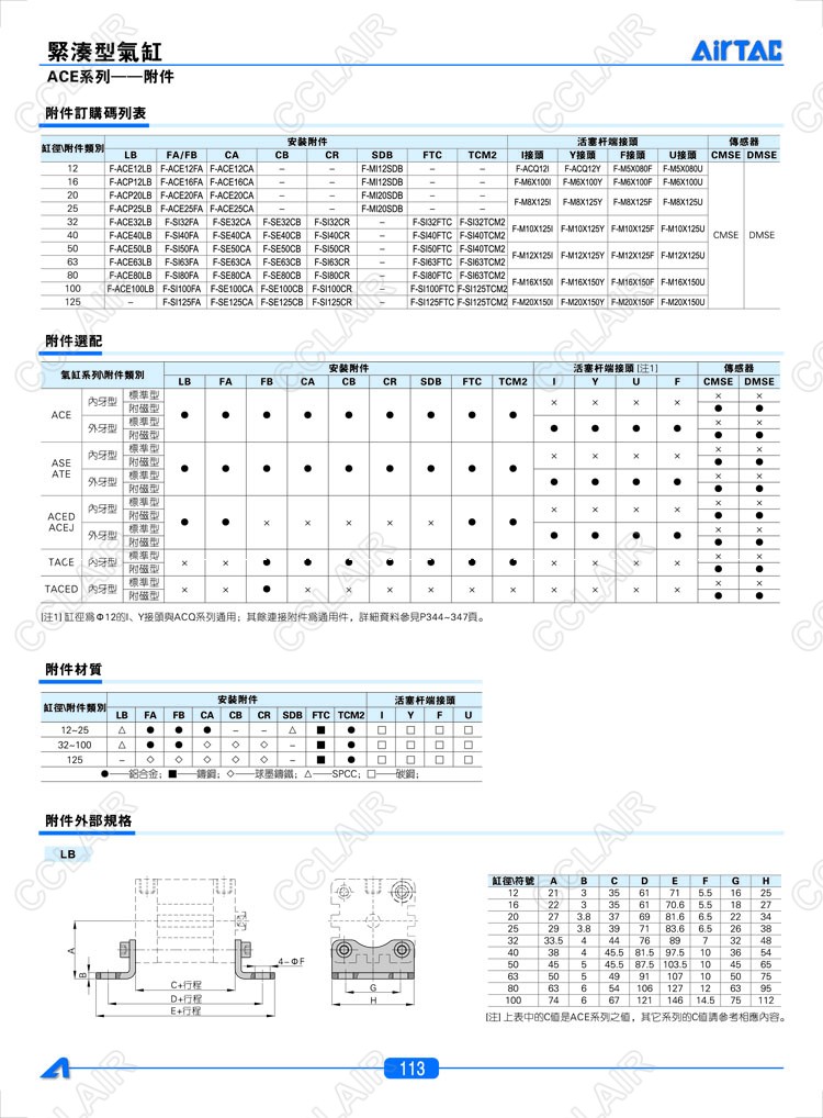 LB12,FA/FB12,CA12,CB32,CR32,SDB12,FTC32,TCM232,F-ACQ12I,F-ACQ12Y,AIRTAC亞德客緊湊型氣缸附件