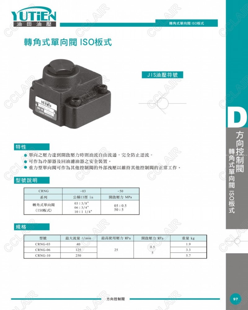 YUTIEN油田轉角式單向閥CRNG-03-05,CRNG-03-50,CRNG-06-05,CRNG-06-50,CRNG-10-05,CRNG-10-50