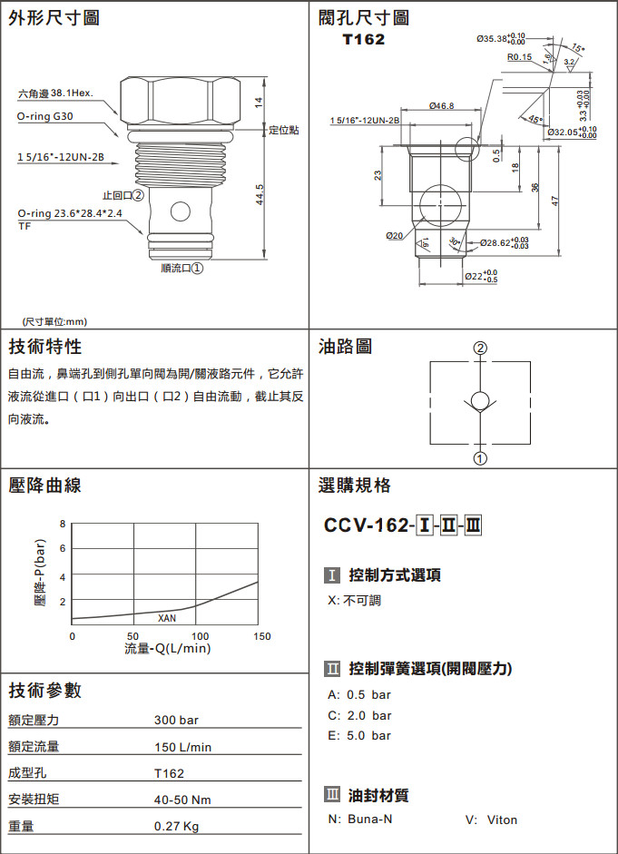 CCV-162-XAN,CCV-162-XCN,CCV-162-XEN,CCV-162-XAV,CCV-162-XCV,CCV-162-XEV,單向閥(口1通口2自由流)