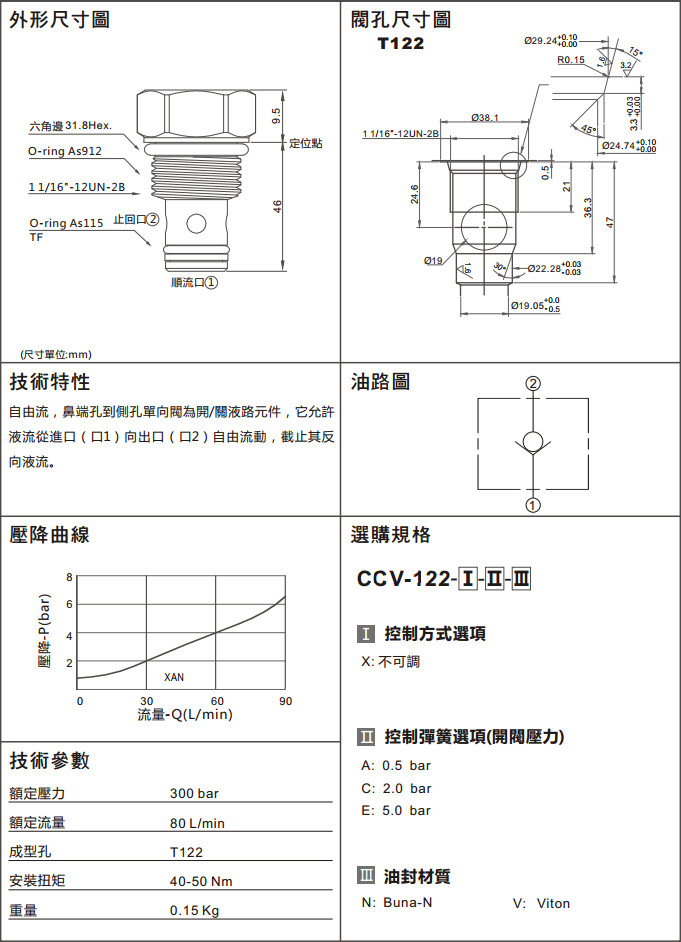 CCV-122-XAN,CCV-122-XCN,CCV-122-XEN,CCV-122-XAV,CCV-122-XCV,CCV-122-XEV,單向閥(口1通口2自由流)