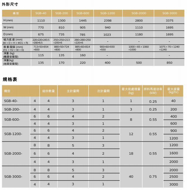 SGB-40-4,SGB-200-4,SGB-600-4,SGB-600-6,SGB-1200-4,SGB-1200-6,SGB-2000-4,SGB-2000-6,SGB-2000-8,SGB-3000-4,SGB-3000-6,SGB-3000-8秤重式拌料混合機