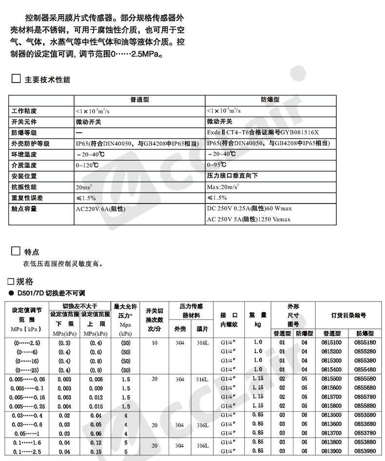 0815108,0813508,0815208,0813608,壓力控制器 D501/7DZ切換差不可調 0815308,0813708,