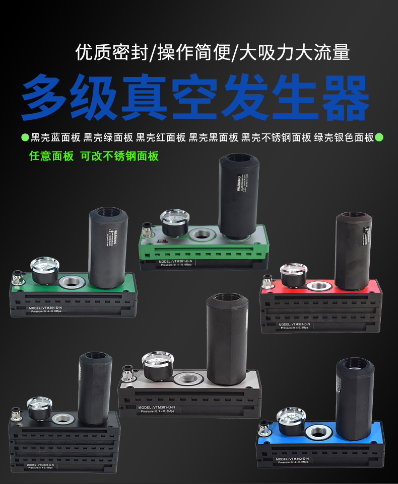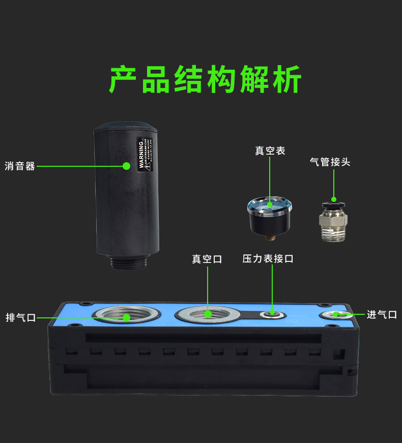 真空發(fā)生器的工作原理主要依賴(lài)于拉瓦爾噴管、?負壓腔和接口管等組件。?氣流從供氣口進(jìn)入,?經(jīng)過(guò)噴管射出,?形成高速射流。?由于氣體的黏性,?高速射流會(huì )吸走負壓腔內的氣體,?從而在該腔內形成真空。