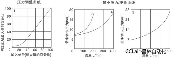 注:1=流量在50L/min時(shí)測得的壓力調整曲線(xiàn);在0輸入信號時(shí)閥的最小壓力流量曲線(xiàn);3=03系列閥、4=06系列閥、05=08系列閥。