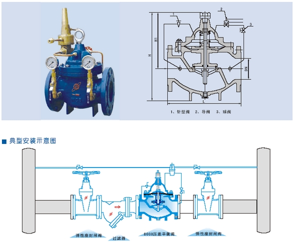 800X壓差旁通閥主要由針閥,壓差控制導閥,球閥,微型過(guò)濾器和壓力表組成水力控制閥接管系統,通過(guò)專(zhuān)門(mén)設計導閥控制室,對壓力變化信號進(jìn)行比較,輸出主閥開(kāi)度信號,控制主閥開(kāi)度,從而控制主閥出口壓差在設定值上。